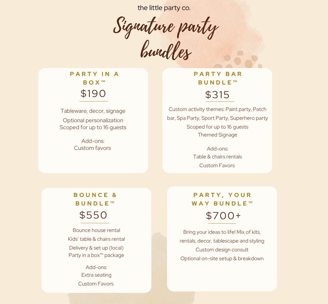 - Party Rentals – kids tables, chairs, tents (local only)